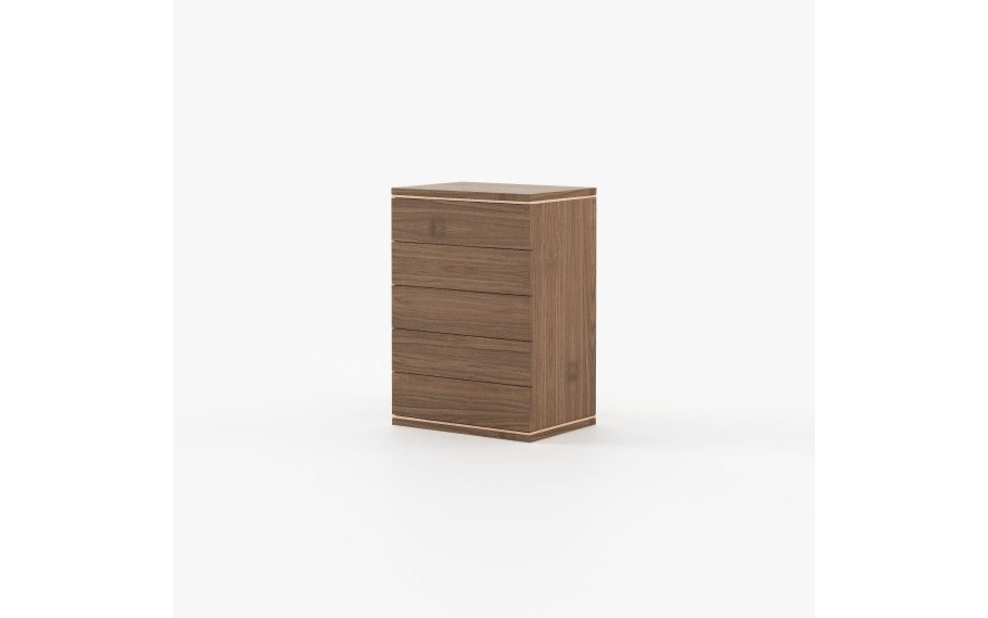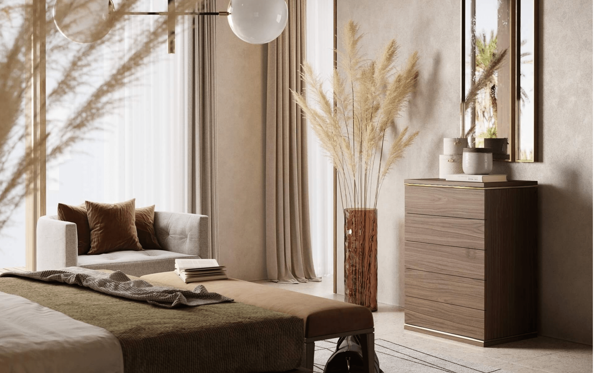 El mueble camisero Duane es una incorporación versátil que se adapta a dormitorios de diversos estilos. Formando parte de la colección Duane, creada con esmero para enriquecer el entorno de descanso, este mueble destaca por sus cajones de cierre suave, dispuestos sin tiradores, y una refinada moldura metálica que realza la belleza de los tonos naturales de la madera.