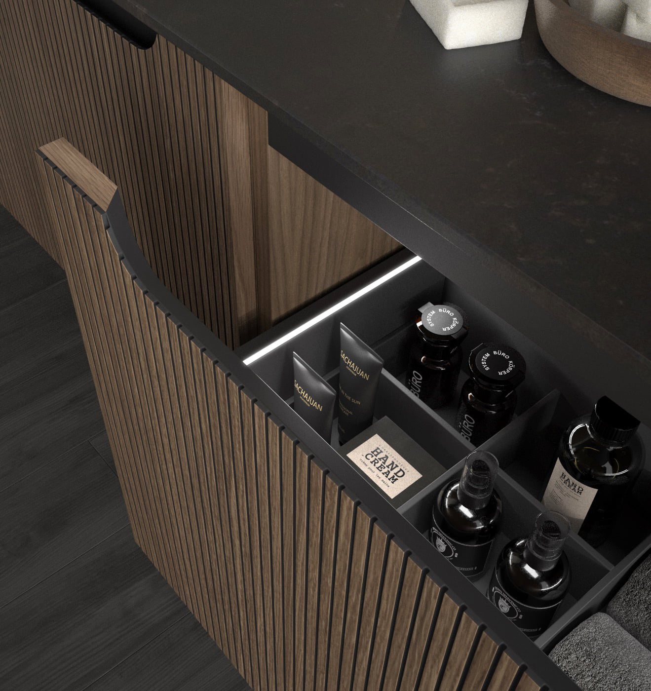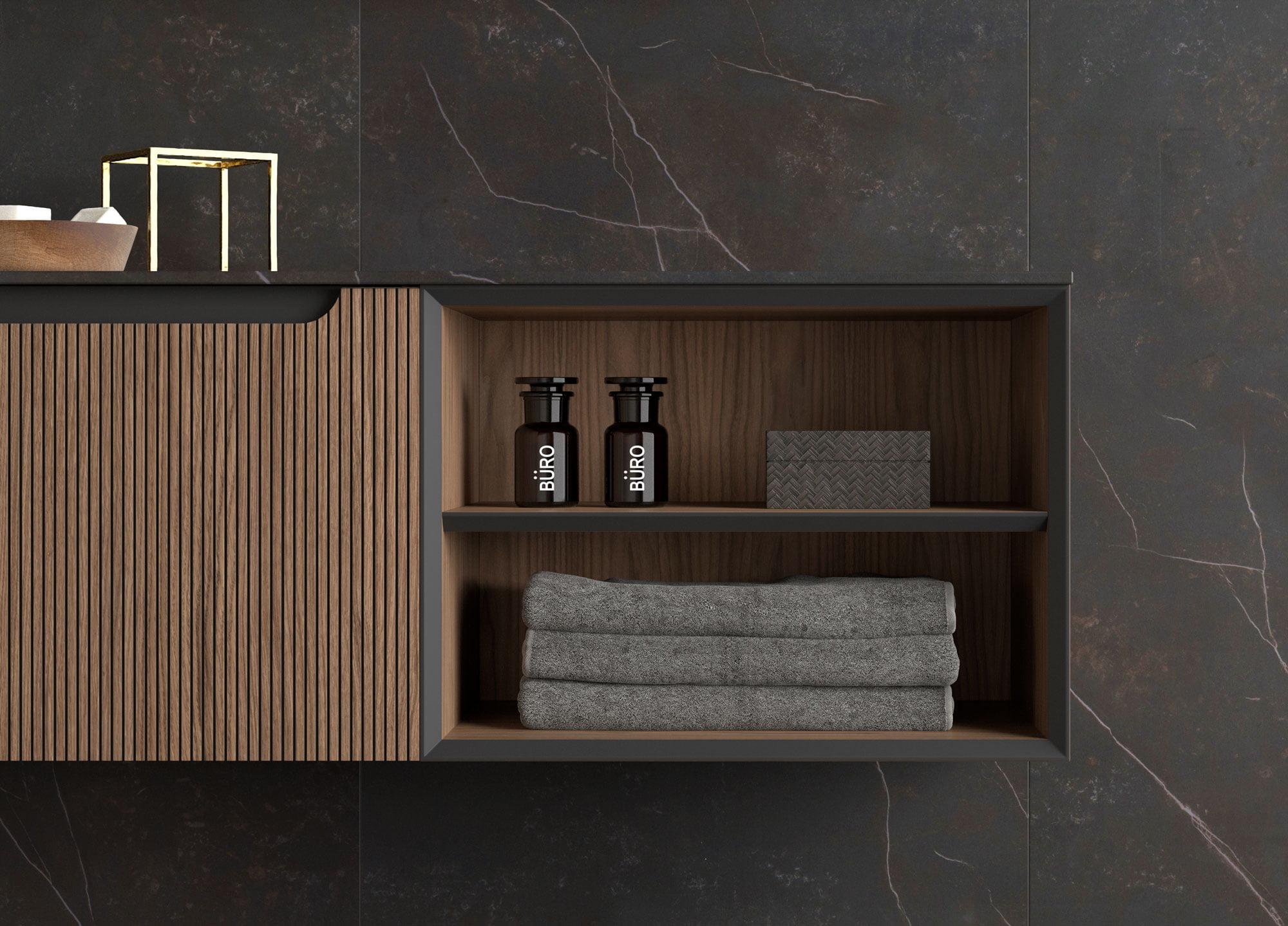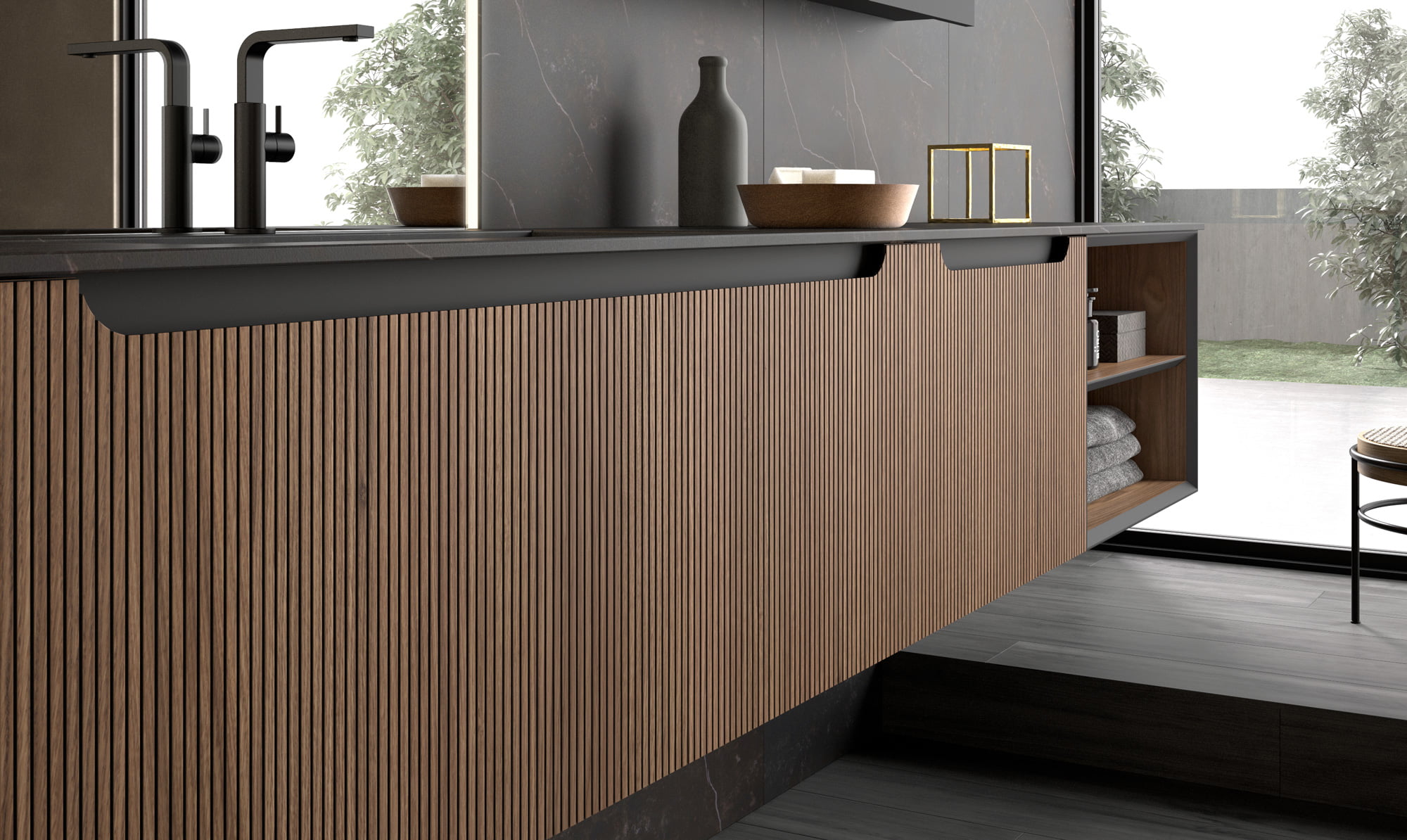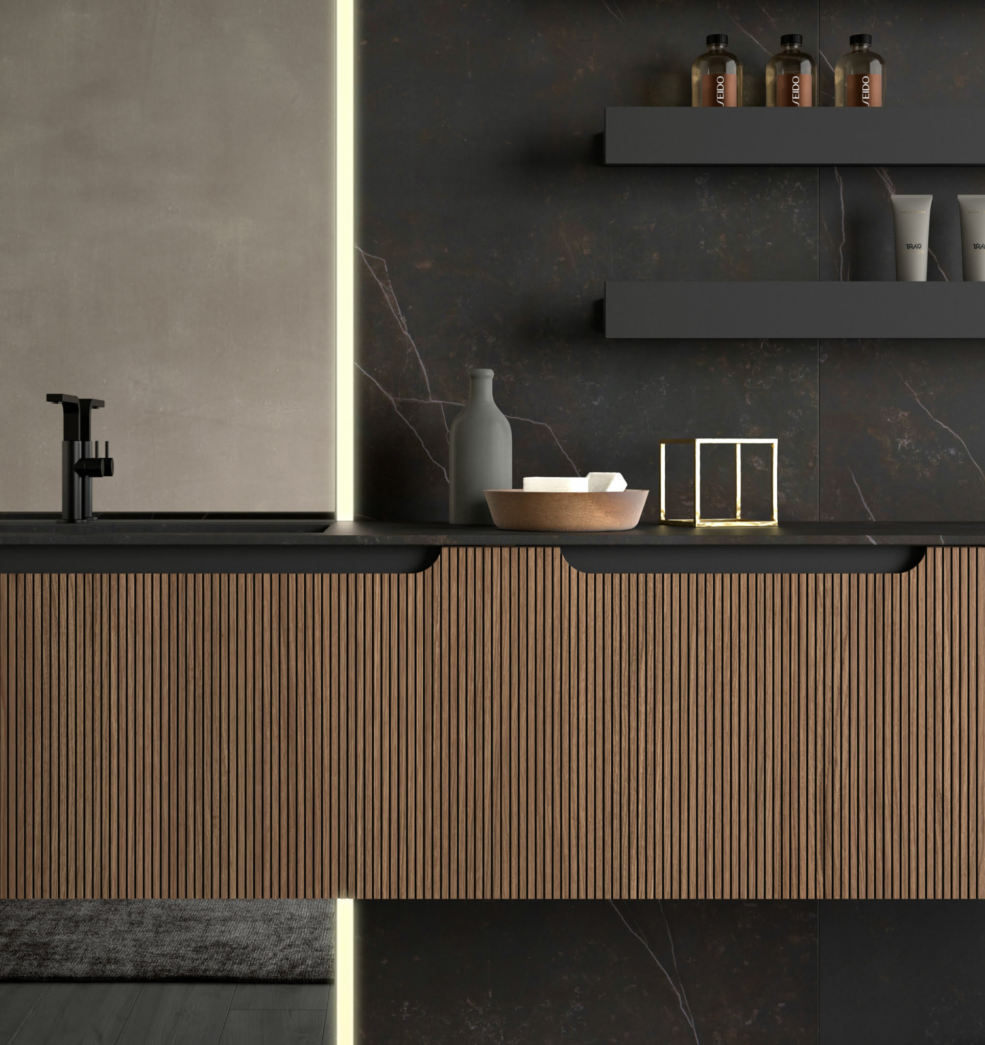La nueva colección Kimono presenta un diseño de frente acanalado en laca y en chapa natural de nogal americano sobre fibra de color negro. Una colección de exquisita fabricación repleta de detalles que la hacen única. Uñero biselado que permite visualizar la barra color carbón a juego con los cantos de fibra negra de la estantería suspendida abierta; nuevo cajón interior compatible con encimeras planas y de faldón, opción de iluminación led interior para cajones sin necesidad de tomas eléctricas, MAT, nuevo elemento decorativo de lavabos y protector de tapas…