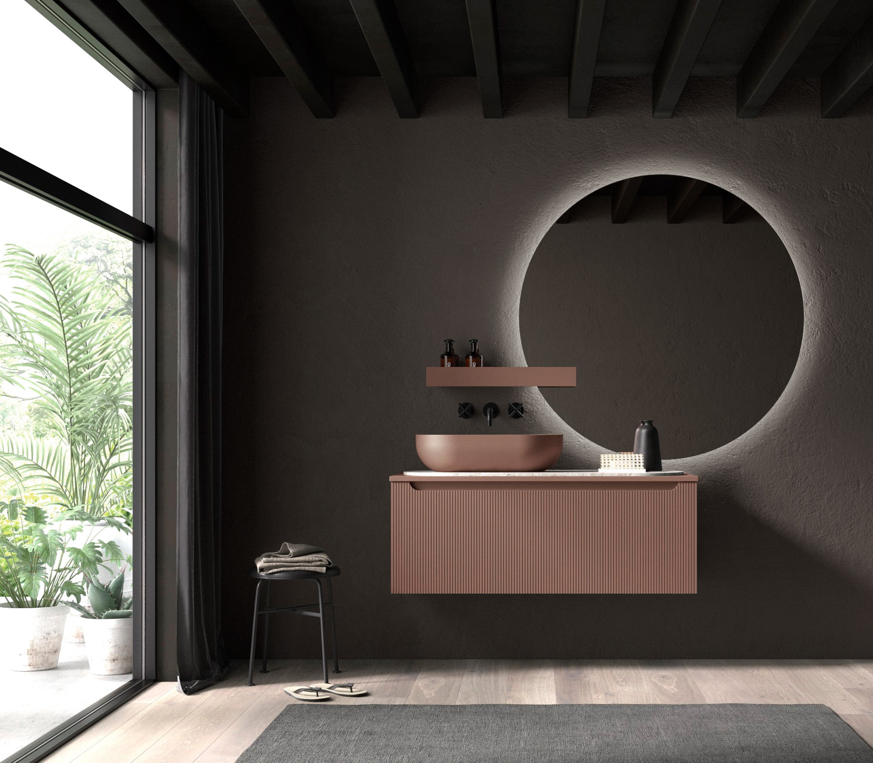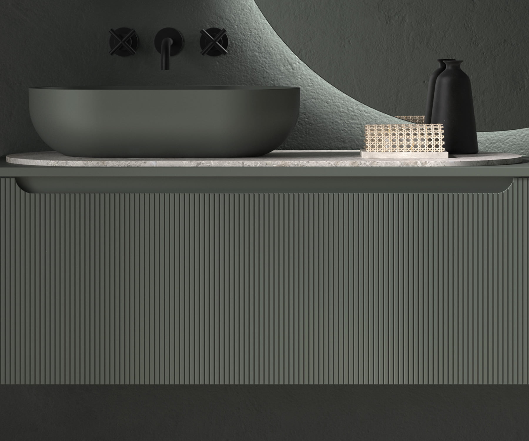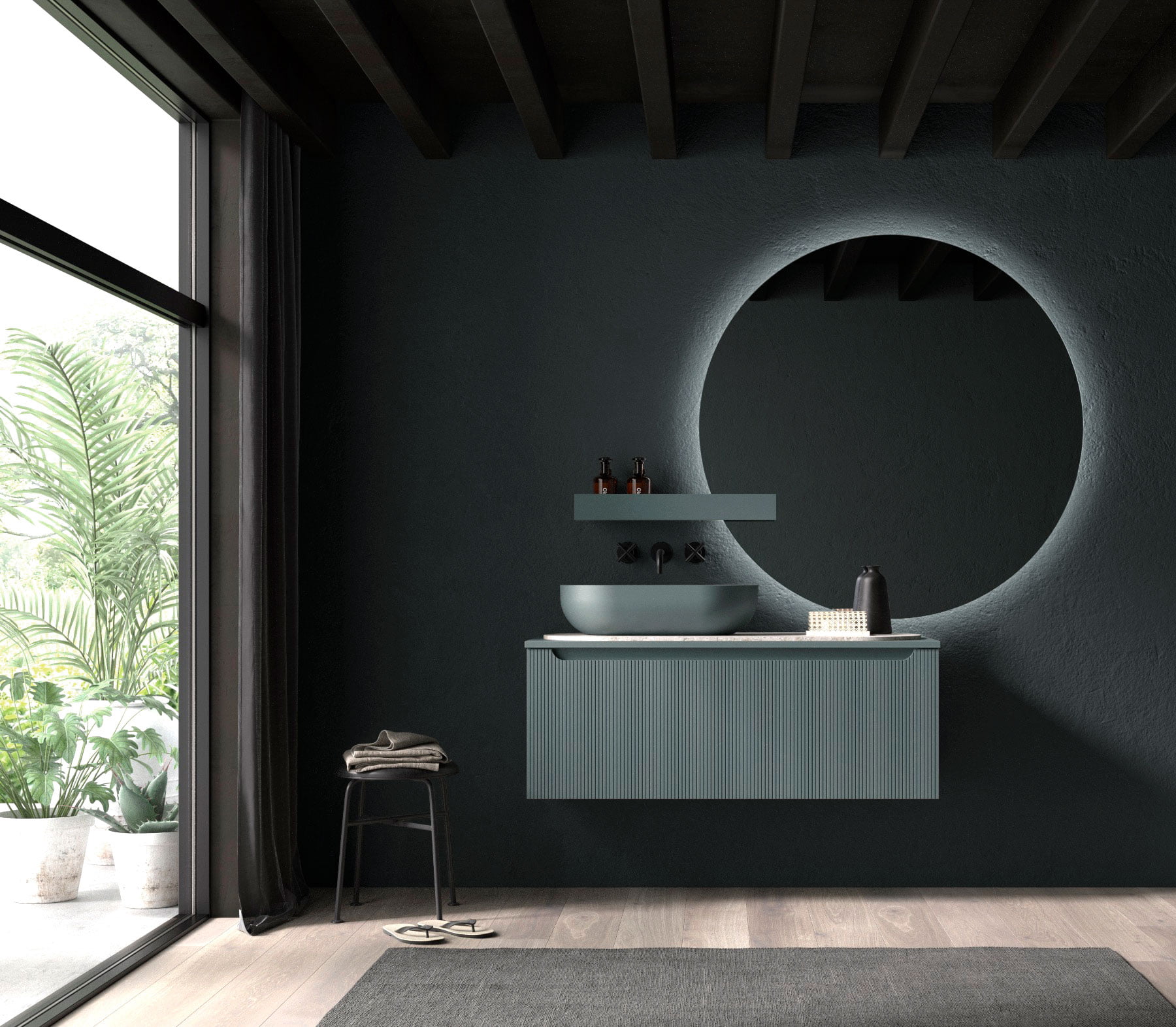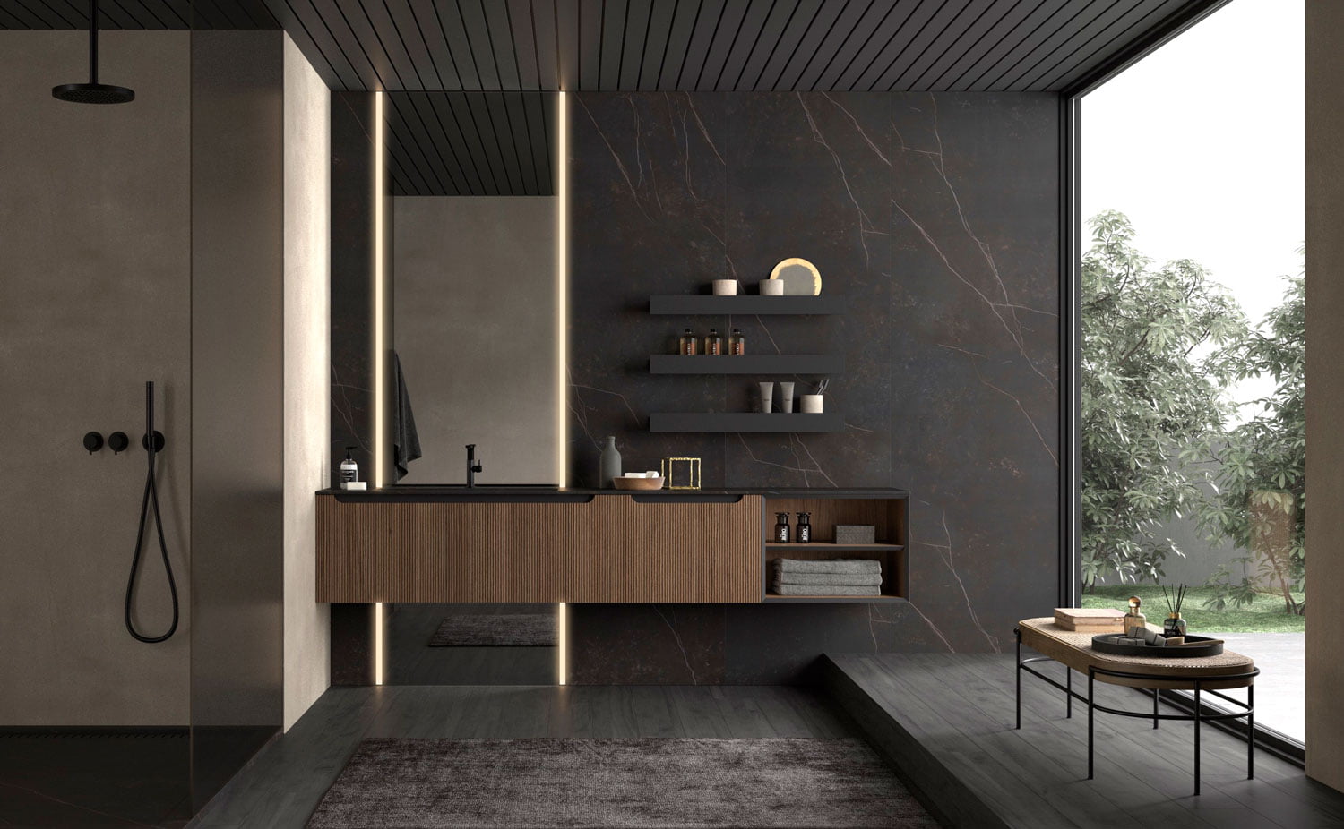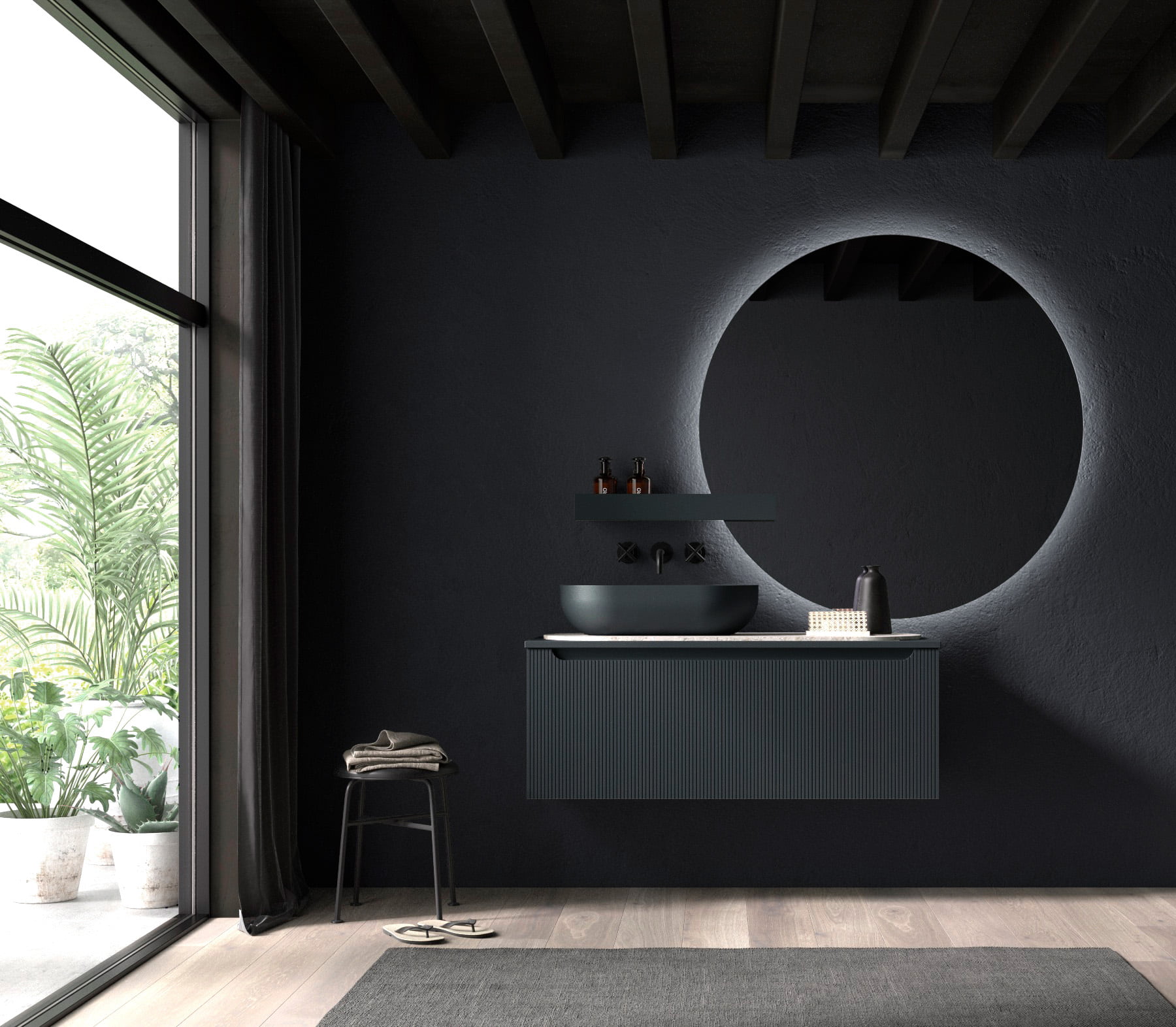 La nueva colección Kimono presenta un diseño de frente acanalado en laca y en chapa natural de nogal americano sobre fibra de color negro. Una colección de exquisita fabricación repleta de detalles que la hacen única. Uñero biselado que permite visualizar la barra color carbón a juego con los cantos de fibra negra de la estantería suspendida abierta; nuevo cajón interior compatible con encimeras planas y de faldón, opción de iluminación led interior para cajones sin necesidad de tomas eléctricas, MAT, nuevo elemento decorativo de lavabos y protector de tapas…