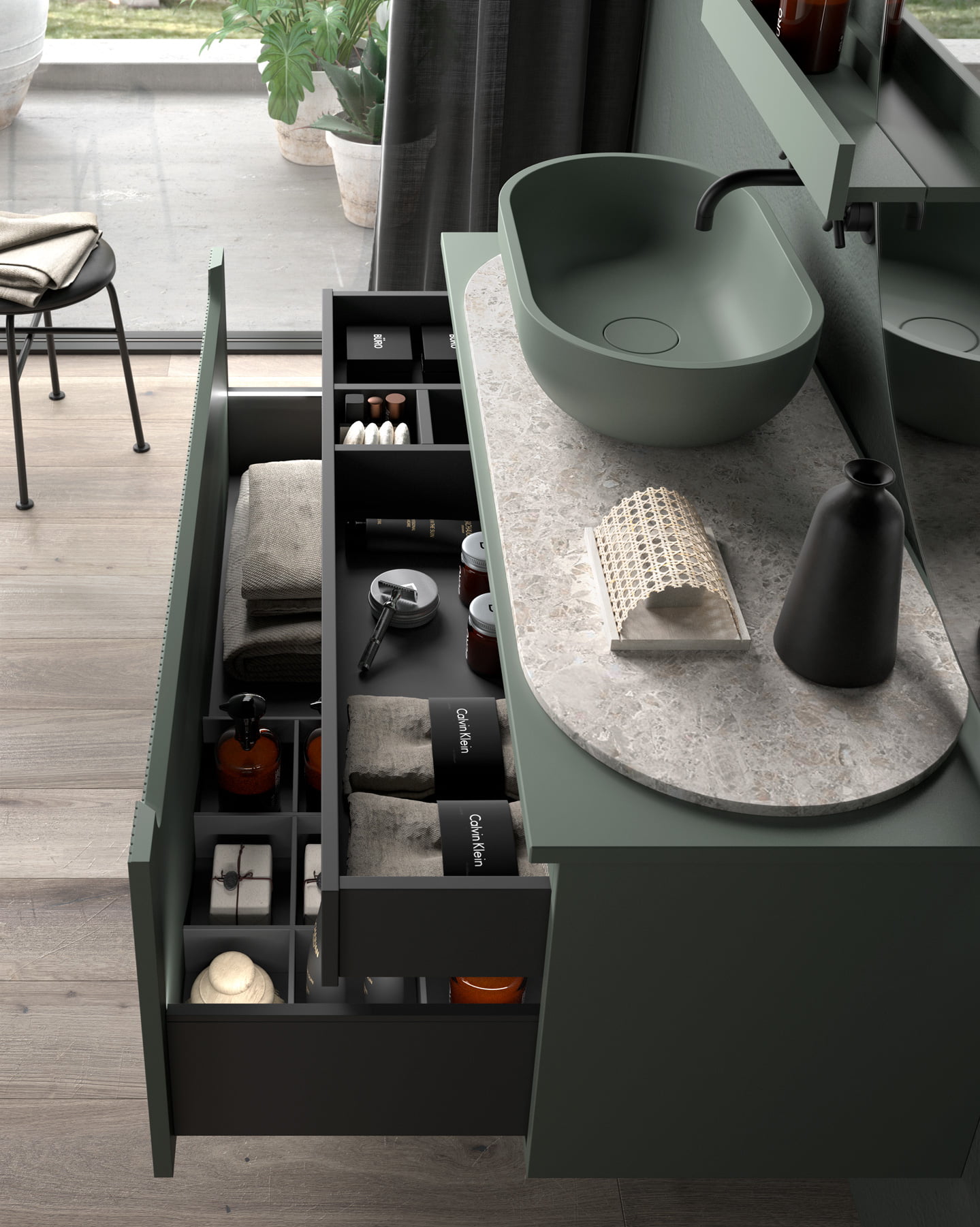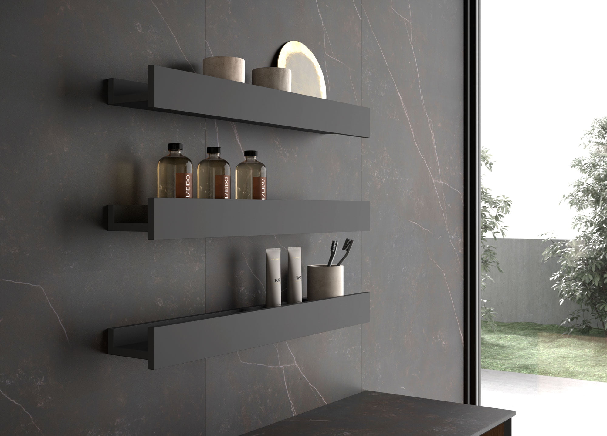 La modularidad de la colección Kimono se basa en distintas opciones de medidas estándares en portalavabos de 1 cajón (60, 80, 100 y 120 cm), combinable con módulos auxiliares bajos de 1 cajón (en medidas fijas de 40, 60, 80, 100 y 120 cm), ámbos con frentes alistonados y cuyo uñero biselado permite visualizar la barra color carbón a juego con la estantería abierta ingletada con cantos biselados vistos en fibra negra y disponible en ancho ajustable al cm (desde 30cm hasta 60cm).