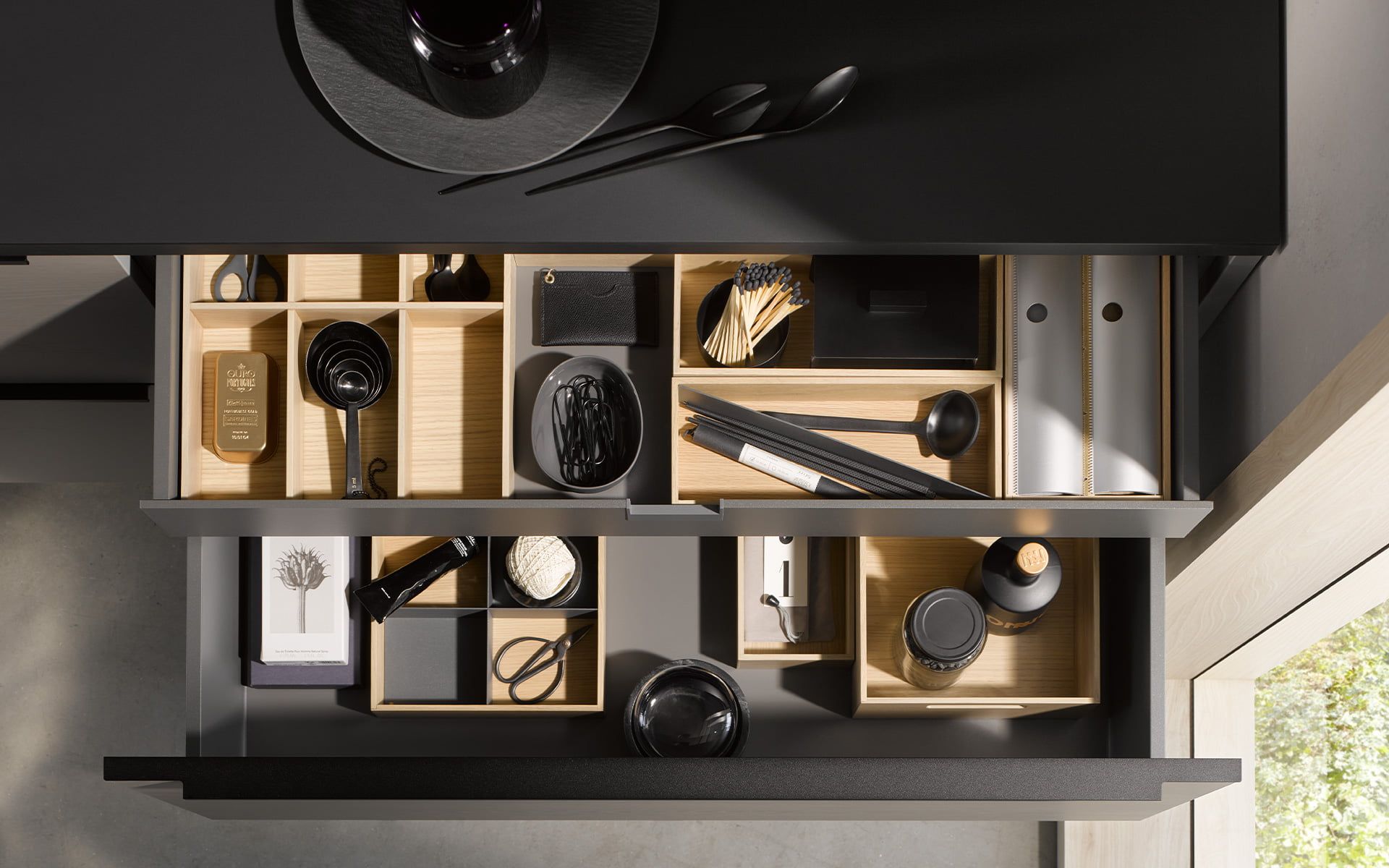 El sistema de módulos extraíbles Metro Box, equipados con organización interior MOVE, nos seduce a primera vista. Los materiales de alta calidad, como la madera auténtica y el metal, aportan un look limpio y purista, además de ser muy duraderos. Un ejemplo de organización cómoda para las cocinas modernas. Mantener el orden nunca fue más fácil.