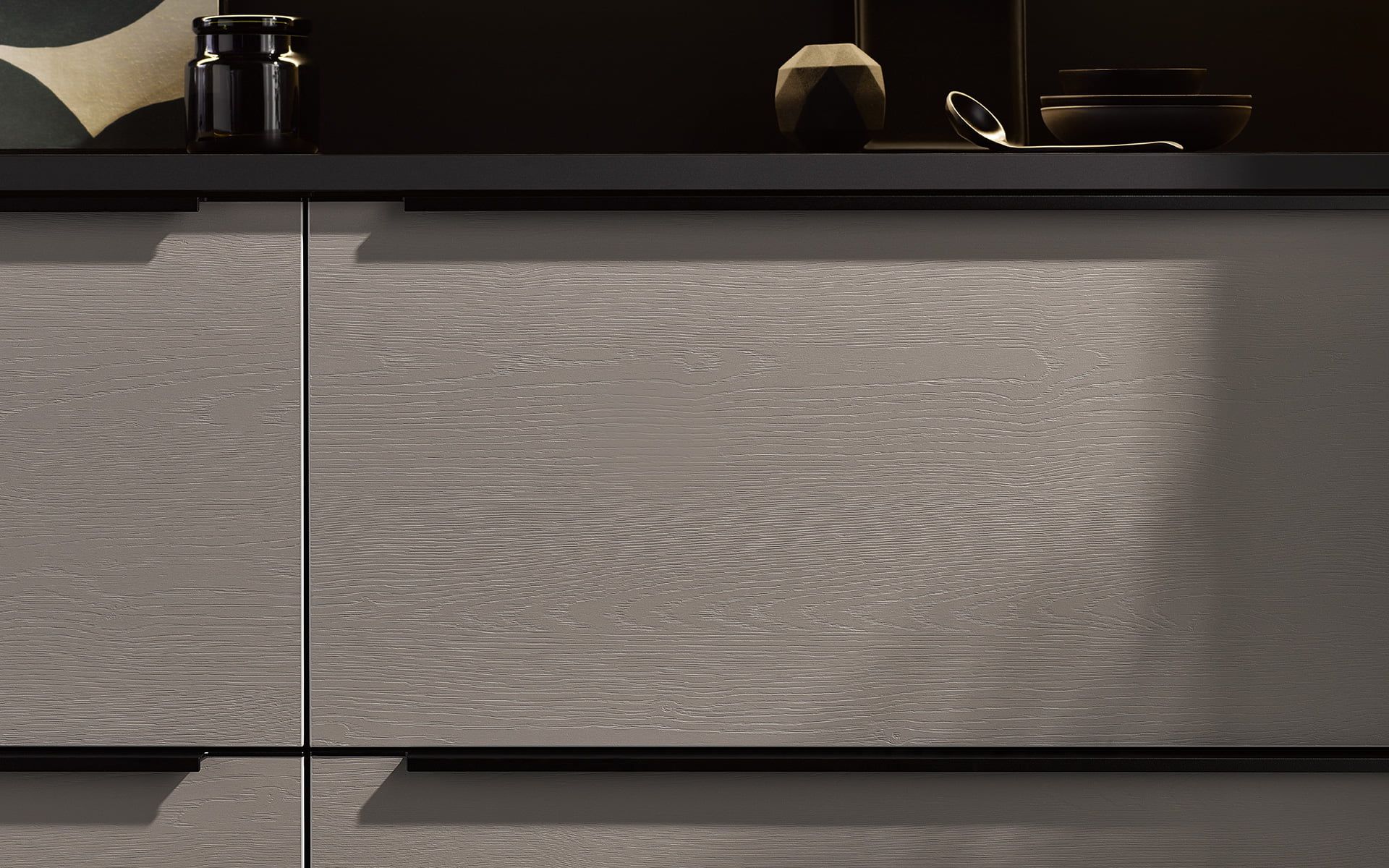 La cocina en roble terciopelo/greige tiene un aire distinguido y agradable. Se nos muestra abierta y moderna, con nada que se interponga en la mirada o el paso de esta cocina tan especial. Los materiales se combinan de forma magistral: el frente de cristal rompe muy bien la uniformidad del conjunto. El aspecto ordenado se consigue con las líneas minimalistas de los armarios y las gavetas.