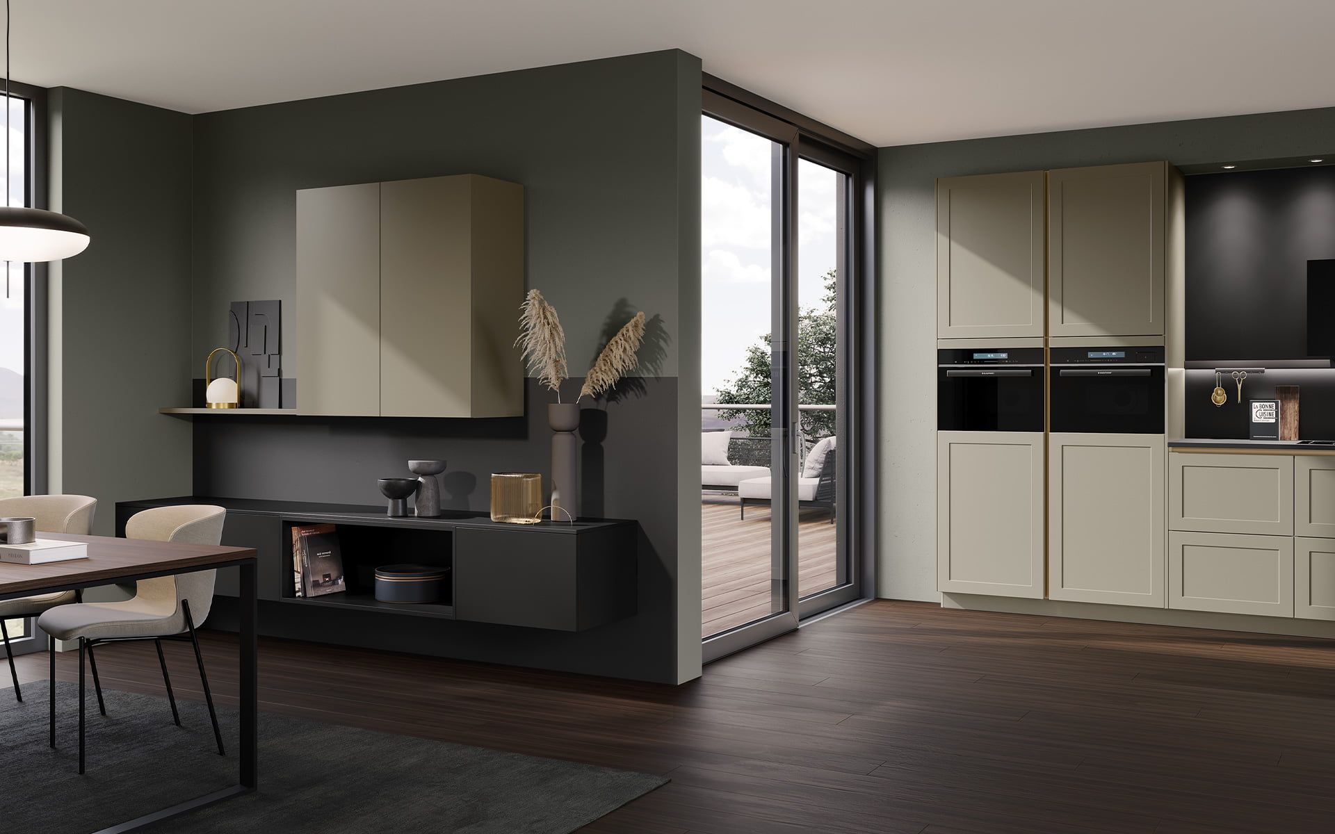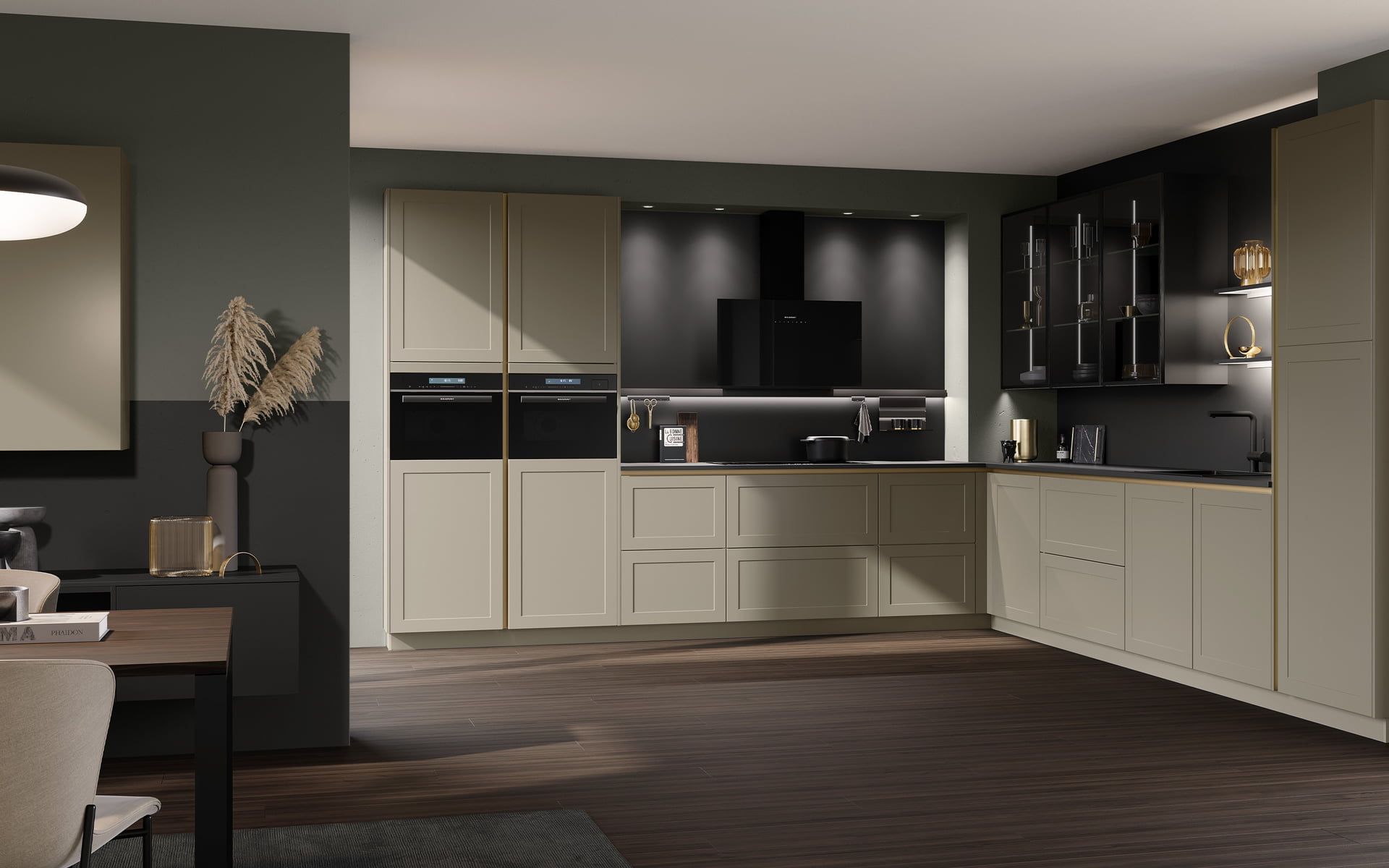 El perfil gola cepillado y de color dorado aporta la dosis justa de esplendor. Ni se pasa ni se queda corto. Así es como mejor resalta este detalle, que también contribuye a crear el efecto visual de los frentes de cocina en umbra natural. El oro es tendencia y esta cocina con perfiles gola dorados es, sin lugar a dudas, una auténtica creadora de tendencias. Asimismo, los detalles brillantes resaltan las formas.