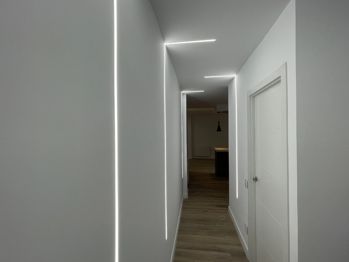 Desde el momento en que se cruza la puerta, la iluminación juega un papel crucial. A lo largo del pasillo y en zonas clave de la vivienda, hemos instalado pequeños focos LED empotrados a ras de suelo, creando un efecto de luz rasante que no solo guía el camino de forma elegante, sino que también resalta la textura del nuevo suelo de madera laminada. Este suelo, en tonos cálidos y naturales, aporta unidad y confort a toda la vivienda, contrastando maravillosamente con las paredes en un blanco inmaculado.
