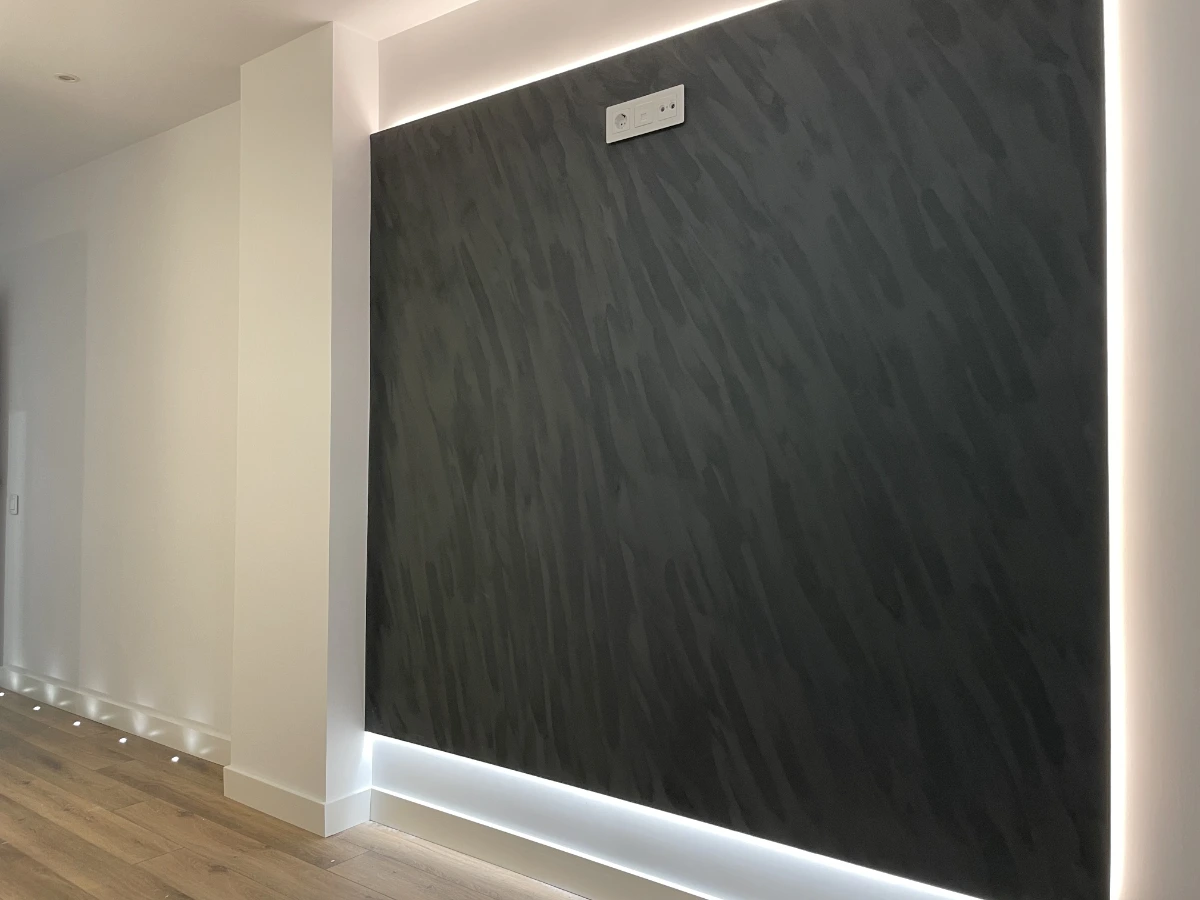 Tanto en la zona que se destinará a salón-comedor como en el dormitorio principal, hemos creado grandes paneles oscuros texturizados que actúan como fondo escénico. Estos paneles no solo son un elemento estético de gran impacto, sino que ocultan toda la preinstalación para sistemas de home cinema y pantallas de gran formato. Además, cuentan con retroiluminación LED perimetral, creando un efecto de pantalla «flotante» y una atmósfera de cine perfecta.