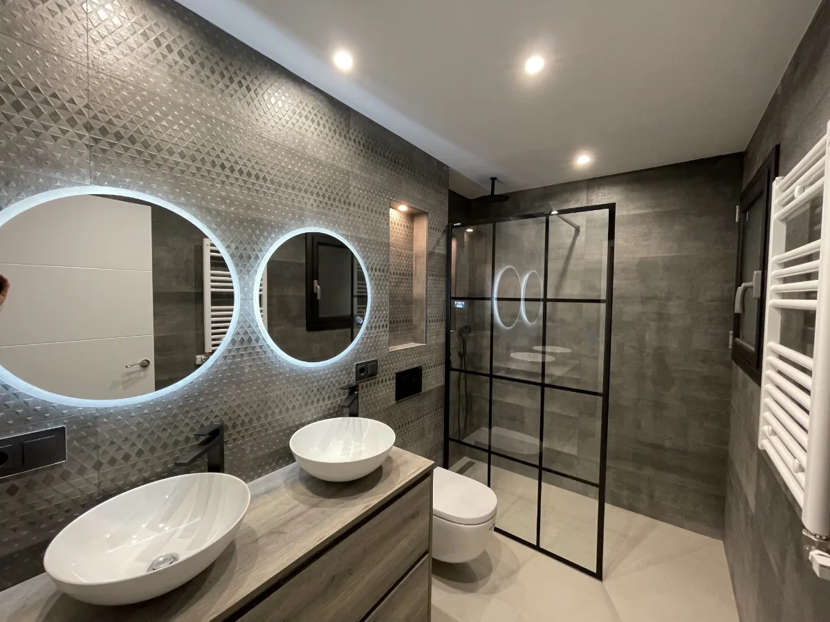 El Baño Principal (Doble): Pensado para el máximo confort, este baño cuenta con un amplio mueble suspendido en acabado madera con doble lavabo tipo bol. El gran espejo doble retroiluminado domina la estancia. La joya es la amplísima ducha a ras de suelo, separada por una elegante mampara de cristal con perfilería y cuarterones en negro mate, a juego con la grifería empotrada y el rociador efecto lluvia. El revestimiento de la zona de ducha presenta un sutil patrón geométrico que aporta profundidad.