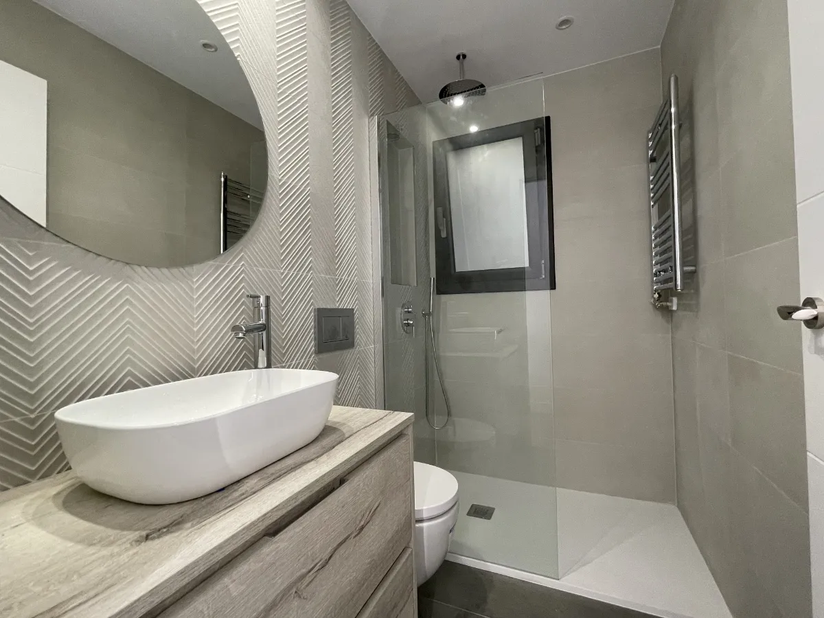 El Baño de Invitados: Siguiendo la misma línea de calidad, este segundo baño optimiza el espacio con un mueble de lavabo simple pero generoso, un espejo circular y una ducha amplia con mampara de cristal transparente. En este caso, destaca el revestimiento texturizado de la pared principal, con un patrón en zigzag que añade dinamismo y elegancia al espacio.