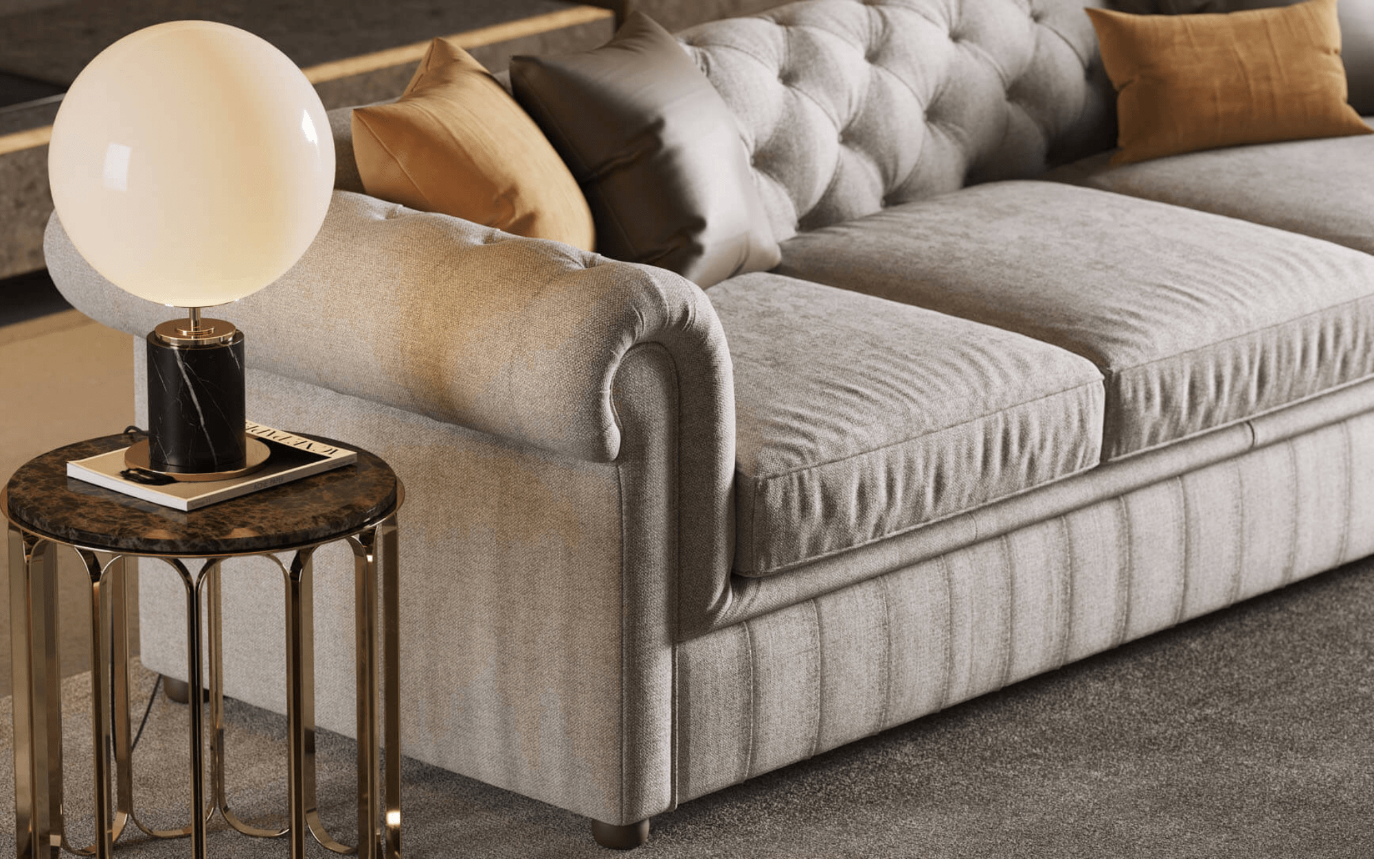 Un sofá de diseño clásico, inspirado en el estilo Chesterfield, que irradia una atemporalidad encantadora. El detalle del capitoné en el respaldo de los asientos agrega un toque de sofisticación distinguida.